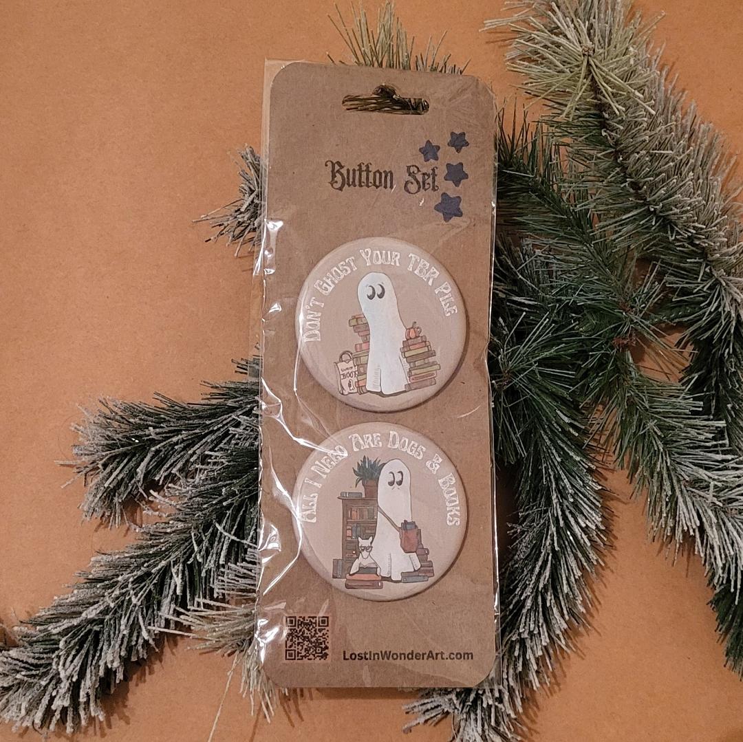 Set of 2 buttons featuring Swoopy Ghost reader images. Swoopy Ghost tells you not to ghost your TBR (To Be Read) pile and that all he needs are books and dogs.