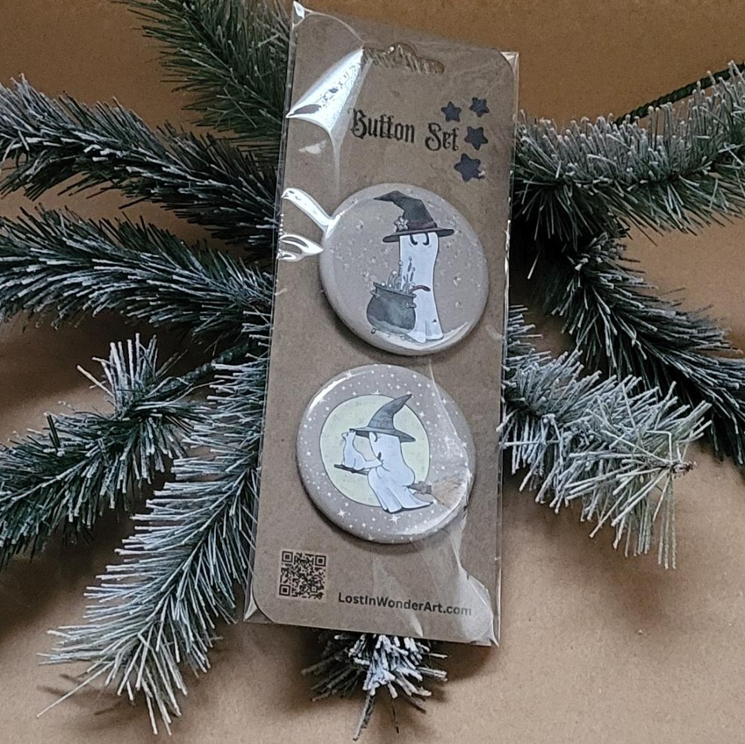 Set of 2 buttons featuring popular designs of Ghost Witch and Flying Witch with Imposter Ghost Cat along for the ride.