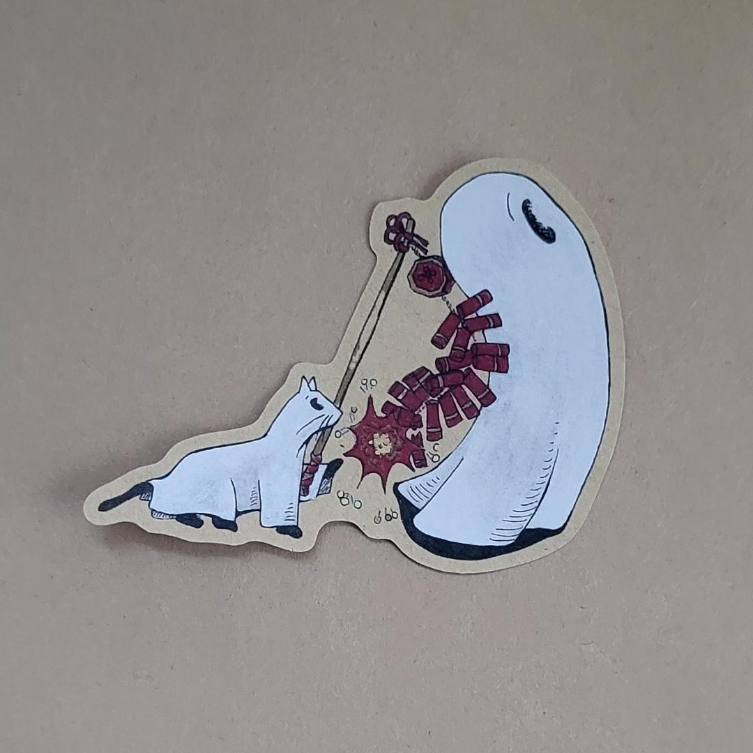 Chaos meets cuteness in this high-energy paper sticker featuring Swoopy Ghost fleeing in terror as the ever-chaotic Imposter Ghost Cat chases behind — gleefully waving lit firecrackers! This explosive scene is packed with personality, perfect for fans of quirky characters, ghostly antics, and a dash of feline mischief.