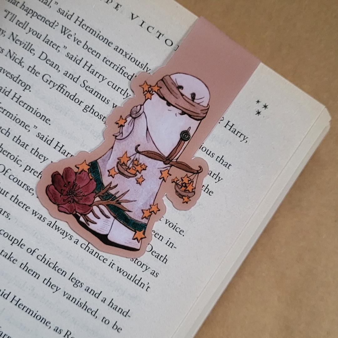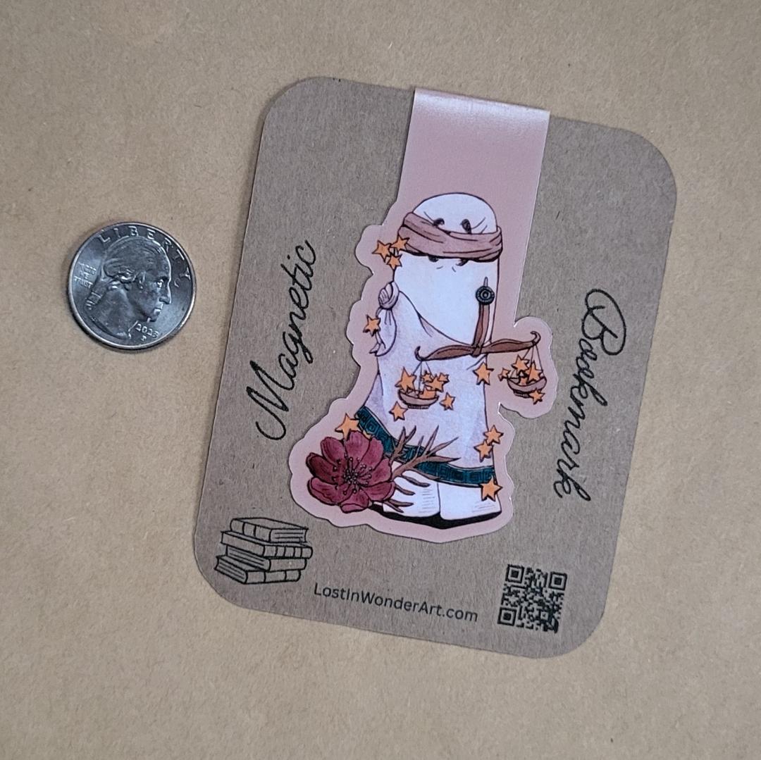 Magnetic bookmark featuring Ms. Swoopy Ghost dressed as Libra with scales zodiac sign. A lovely way to express your astrology sign.