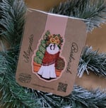 Enjoy this charming way to keep track of your page. This magnetic bookmark features Paprika Ghost wearing a floral crown and elegant greenery scenery. Her lovely shawl is a vibrant red.