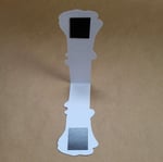 When in use (as pictured in the photo with the book, it is folded in half to use), it measures about 3.27 inches tall. Heavy stock in satin finish.