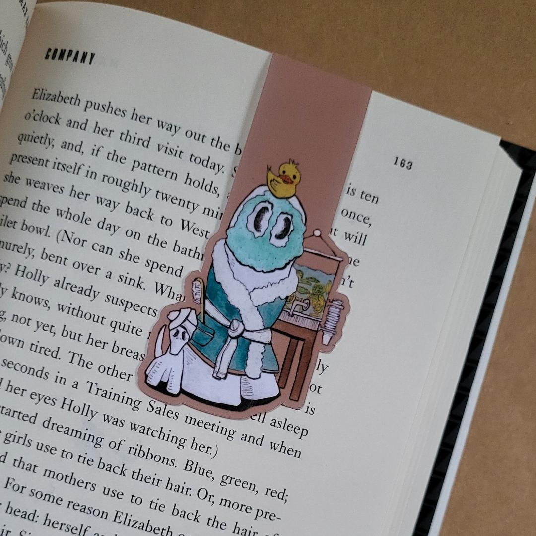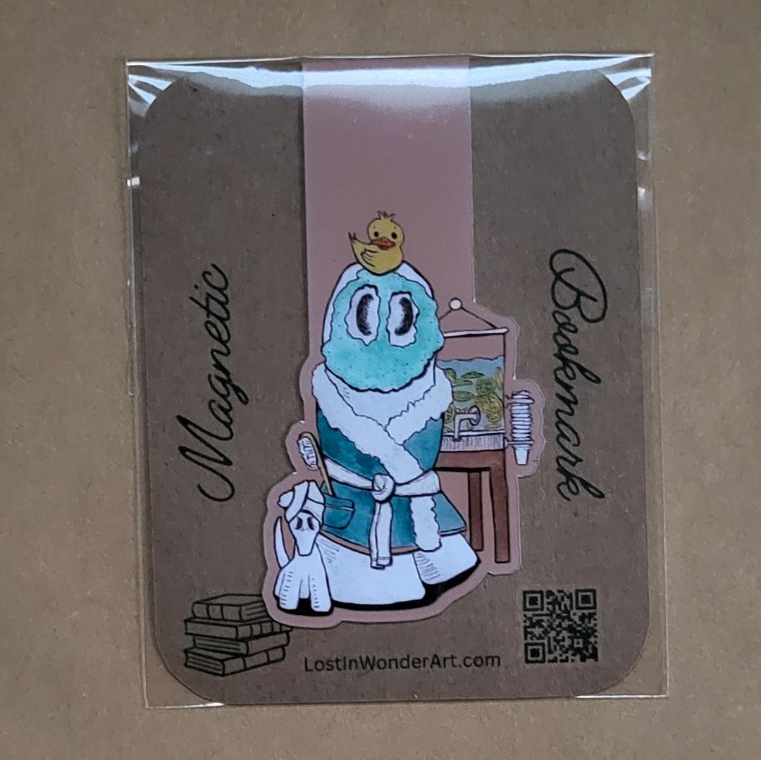 Magnetic Bookmark featuring Swoopy Ghost taking a spa day with his loyal companion, Swoopy Dog. They have spa water, robes, towels, face mask, and even a rubber ducky. Sometimes after Halloween haunting, you need to just take a day for yourself to unwind and kick up your sheet.
