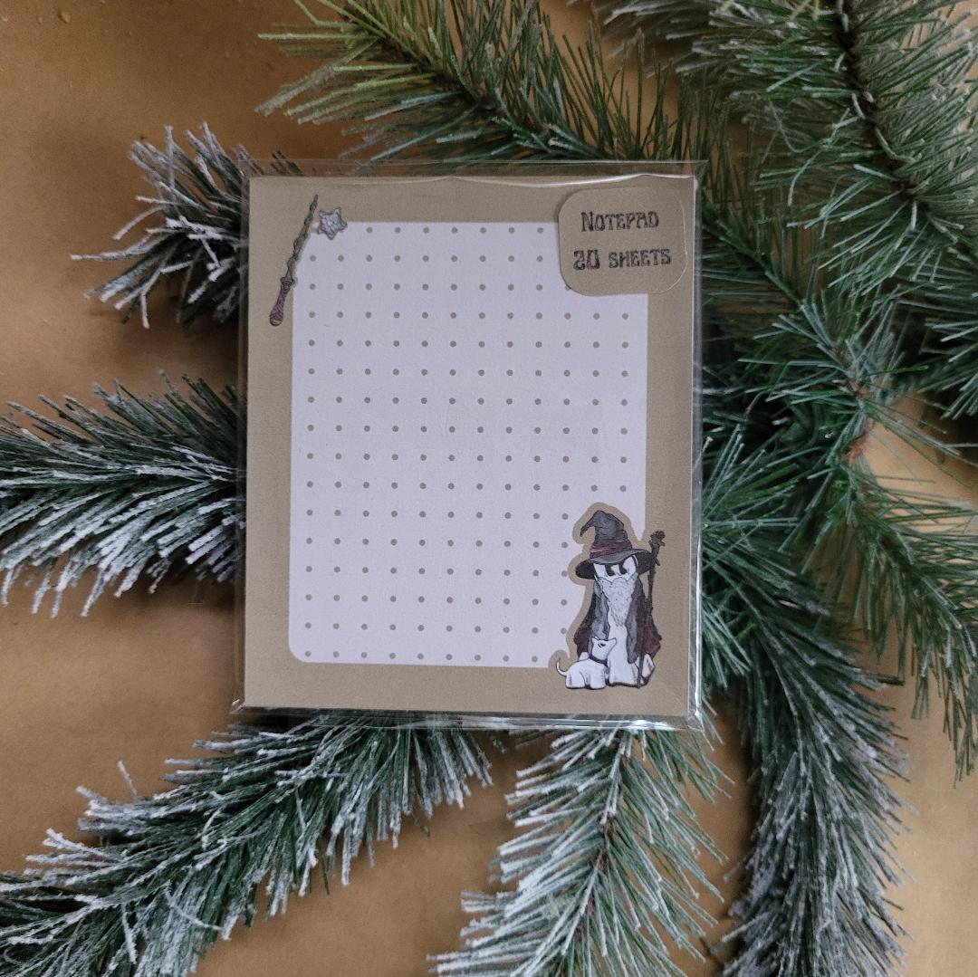 Mini notepad of Swoopy Ghost in a wizard costume, accompanied by his loyal companion, Swoopy Ghost. Gnarly wand in one corner with a crystal star.