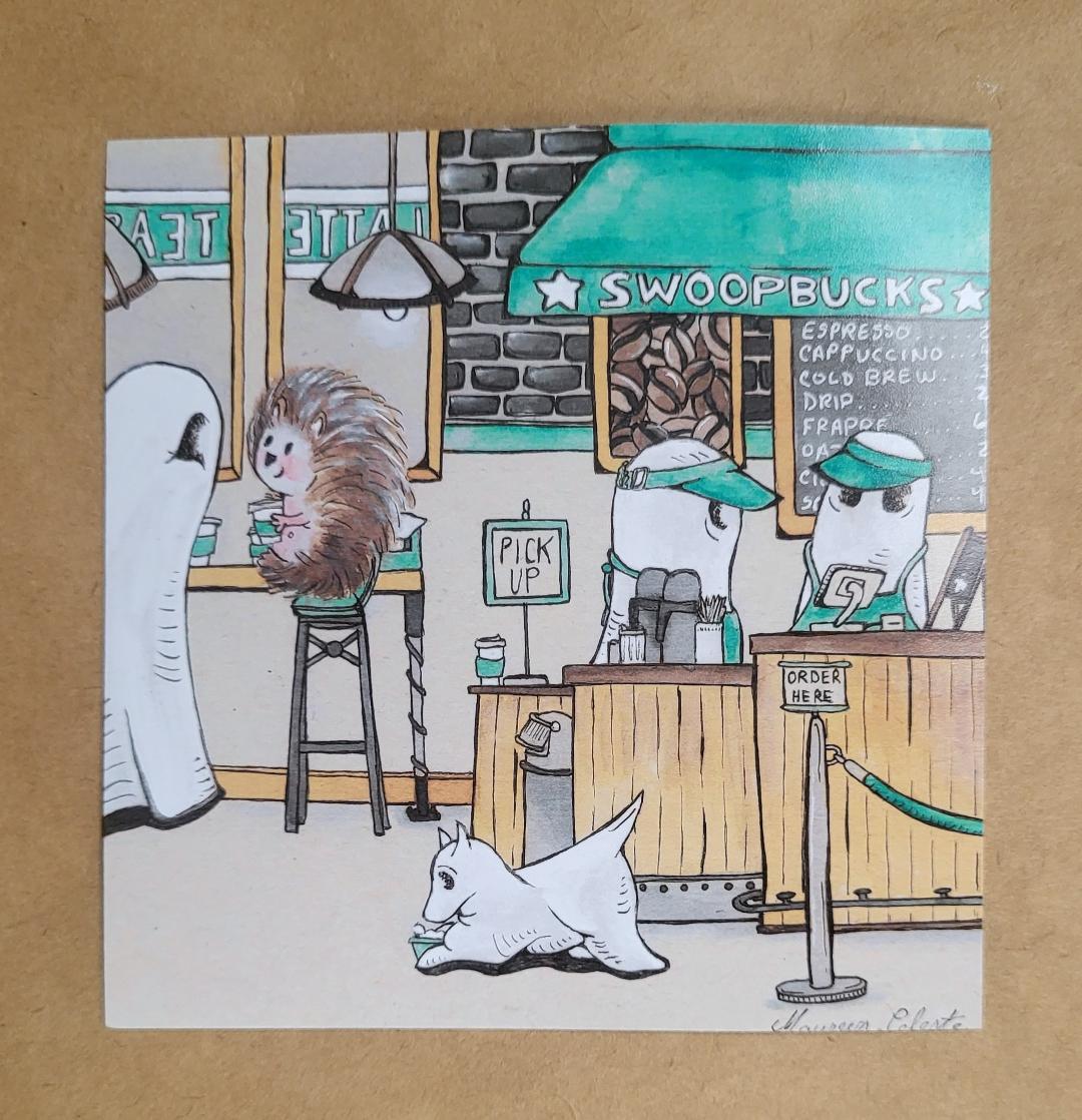 Swoopy Ghost at the Swoopbucks to get his morning caffeine fix and to treat Swoopy Ghost Dog to a pup cup.