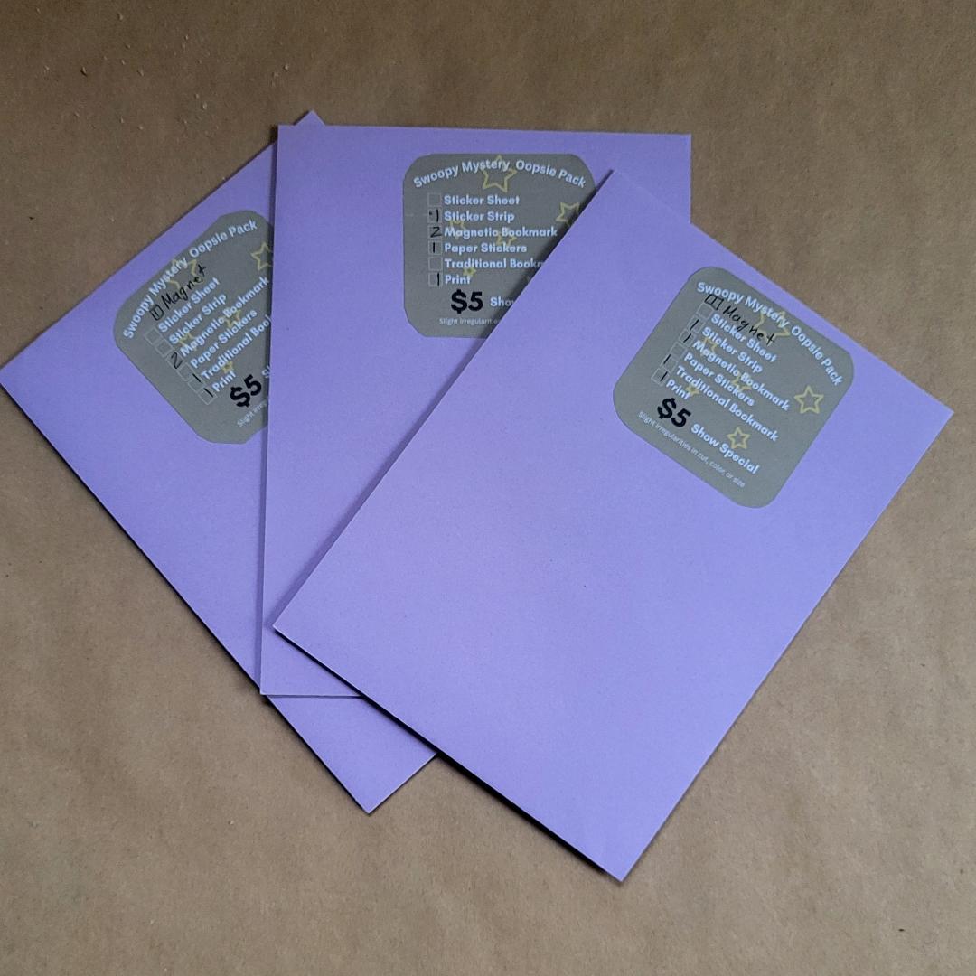 Selection of oopsies. These are items that can have color variations, mis-cuts, or discontinued items. Everything is a little off but perfectly useable. Envelope will contain 5 items that could include magnets, bookmarks, prints, stickers, sticker sheets, or buttons. It will be a fun surprise at great savings! All items will be Swoopy Ghost themed (meaning, no reading animals or vegan badges)