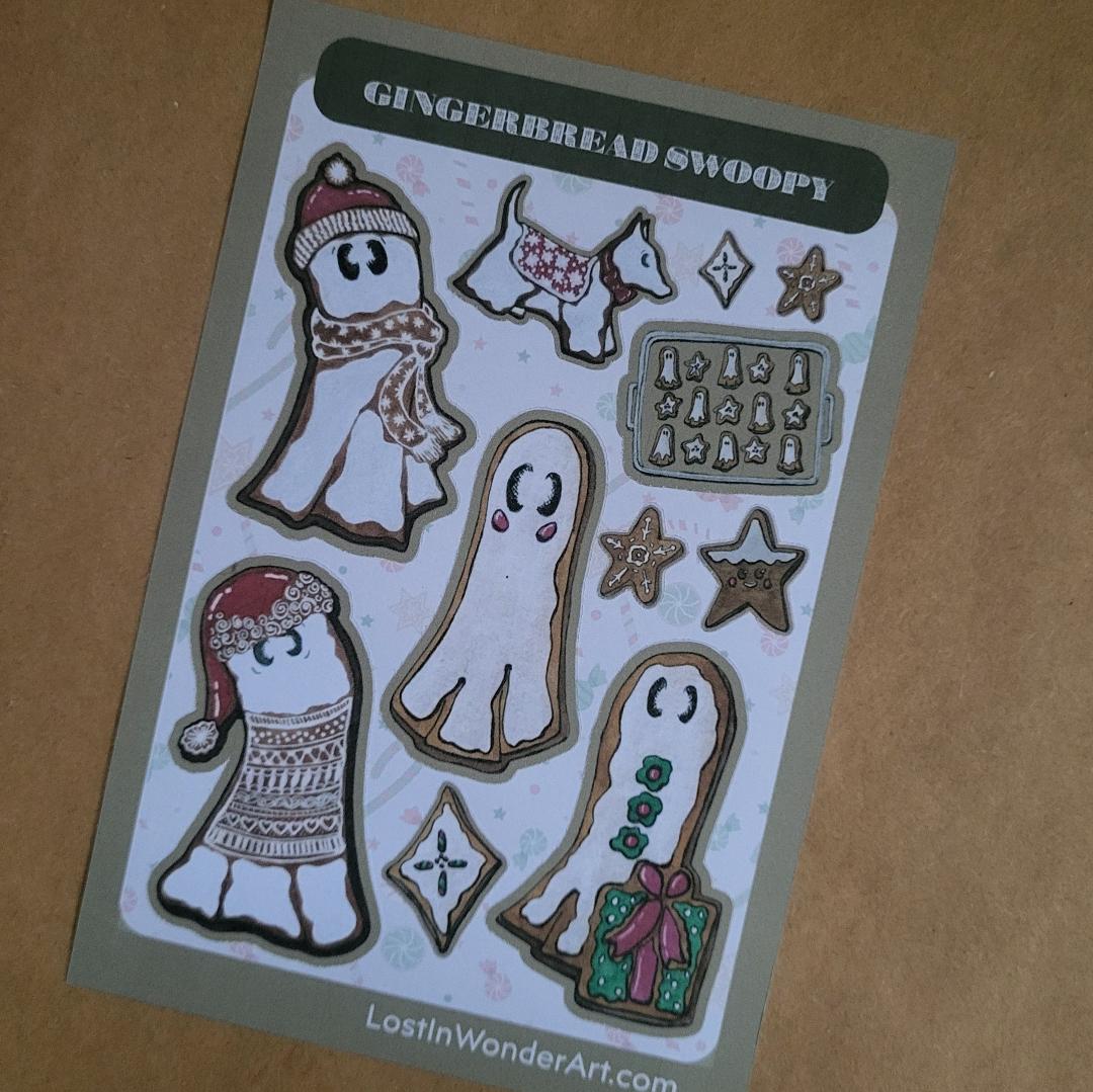 Enjoy these stickers for your mailing your holiday cards, decorating gift wrapped packages, leaving notes, writing appointments, using your planner, or more. This sticker sheet features Swoopy Ghost as delicious looking Gingerbread Cookies, great for the holiday season.