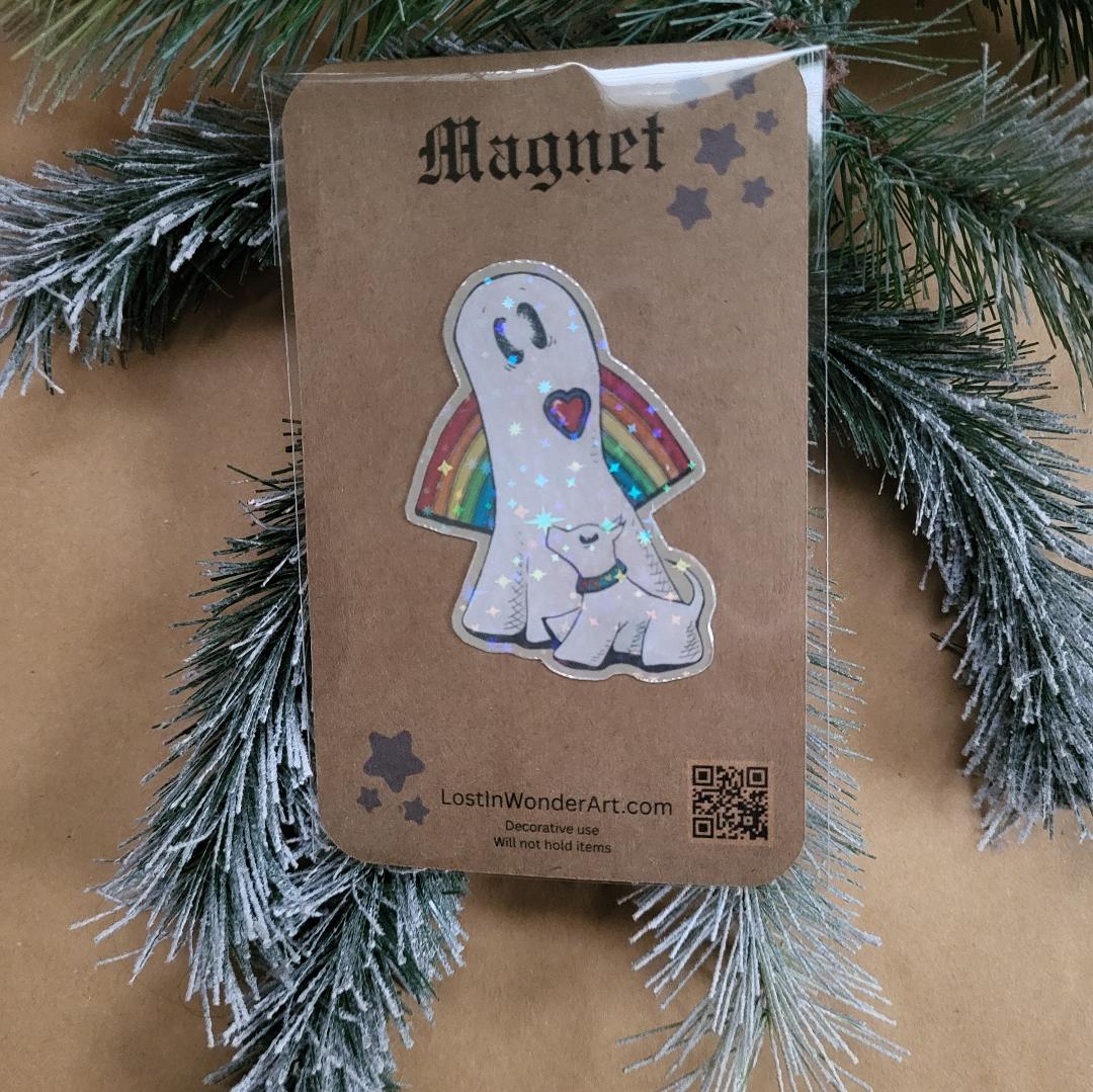 Swoopy Ghost with his loyal dog surrounded by a vibrant rainbow for Pride with holographic stars overlay.