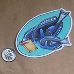 Matte vinyl sticker of a family of blue tang fish reading a book together.