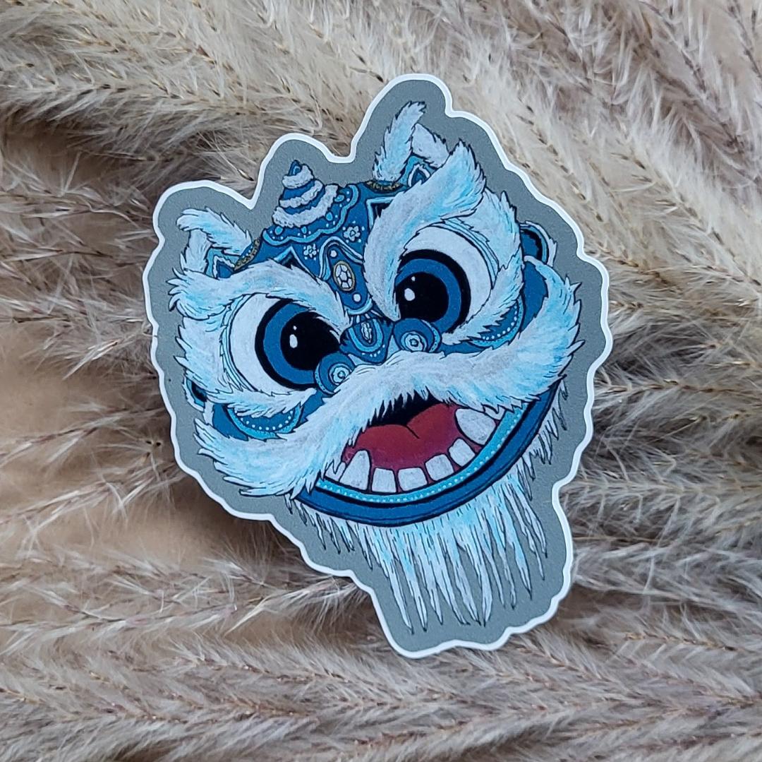 Matte vinyl sticker of a blue Chinese Lion Dance character named, TânTân. Weather resistant and waterproof. Great for laptops, water bottles, tablets, and more. Easy peel backing. Sticker has no white border, what you see is the easy peel backing paper.